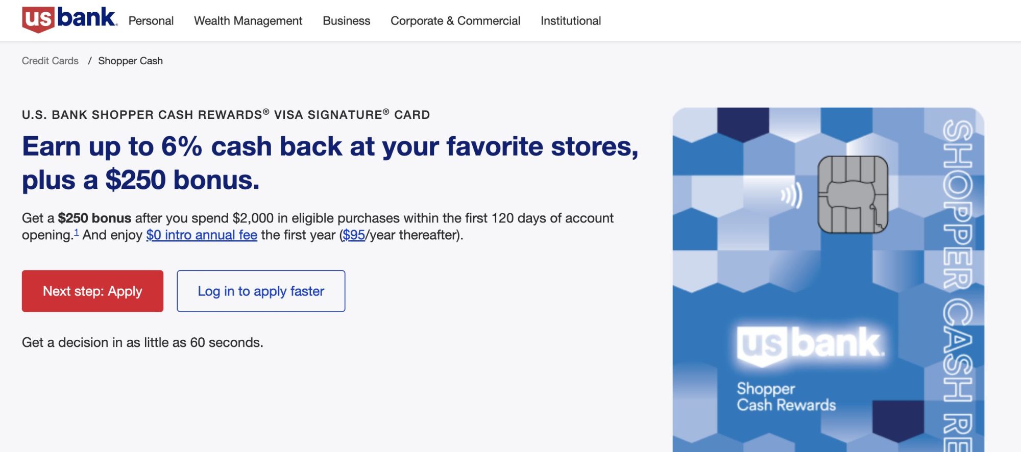 | U.S. Bank Shopper Cash Rewards™ Visa Signature® Card | $200 cash back after spending $2,000 on purchases within 120 days. | 6% cash back on two selected retailers each quarter (up to $1,500). 3% cash back on one selected spending category each quarter (up to $1,500). 1.5% cash back on all other purchases. | $95 (waived in the first year) | 19.74% – 29.74% |