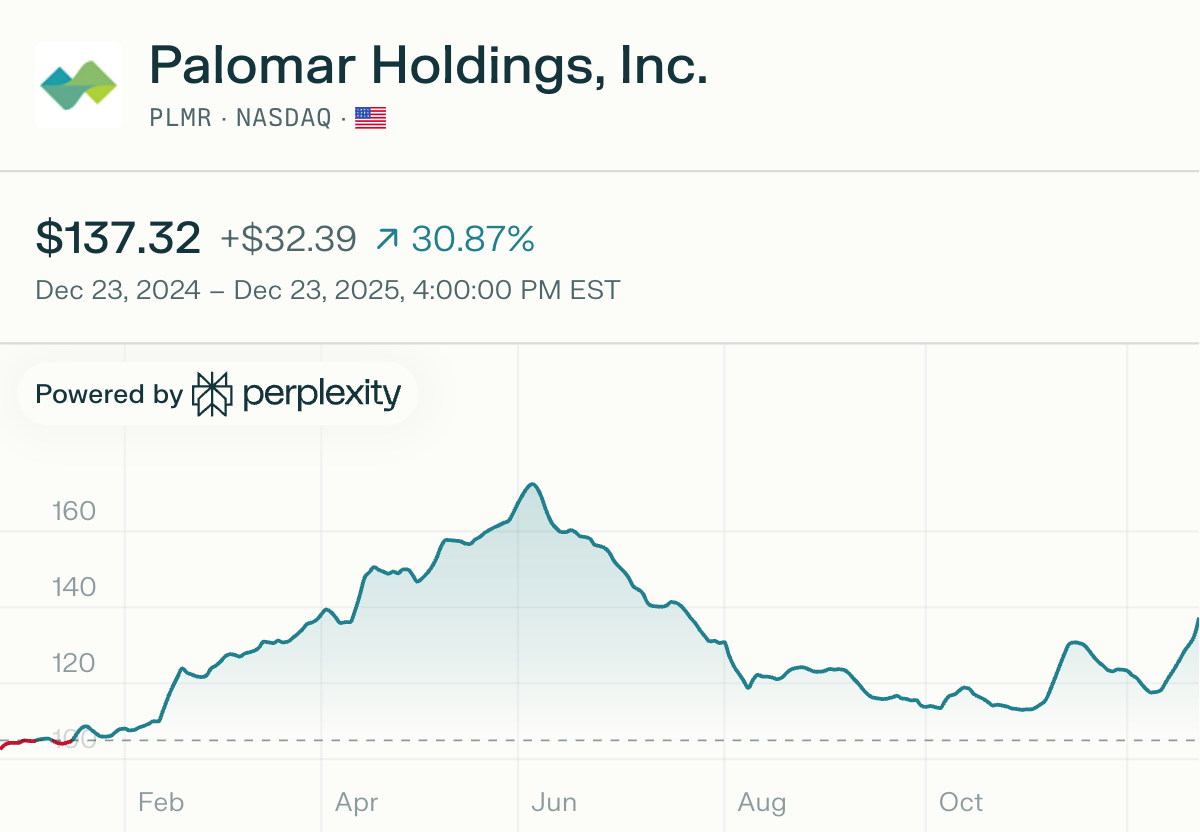 A look at Palomar’s performance over the last 12 months. Data from Perplexity.