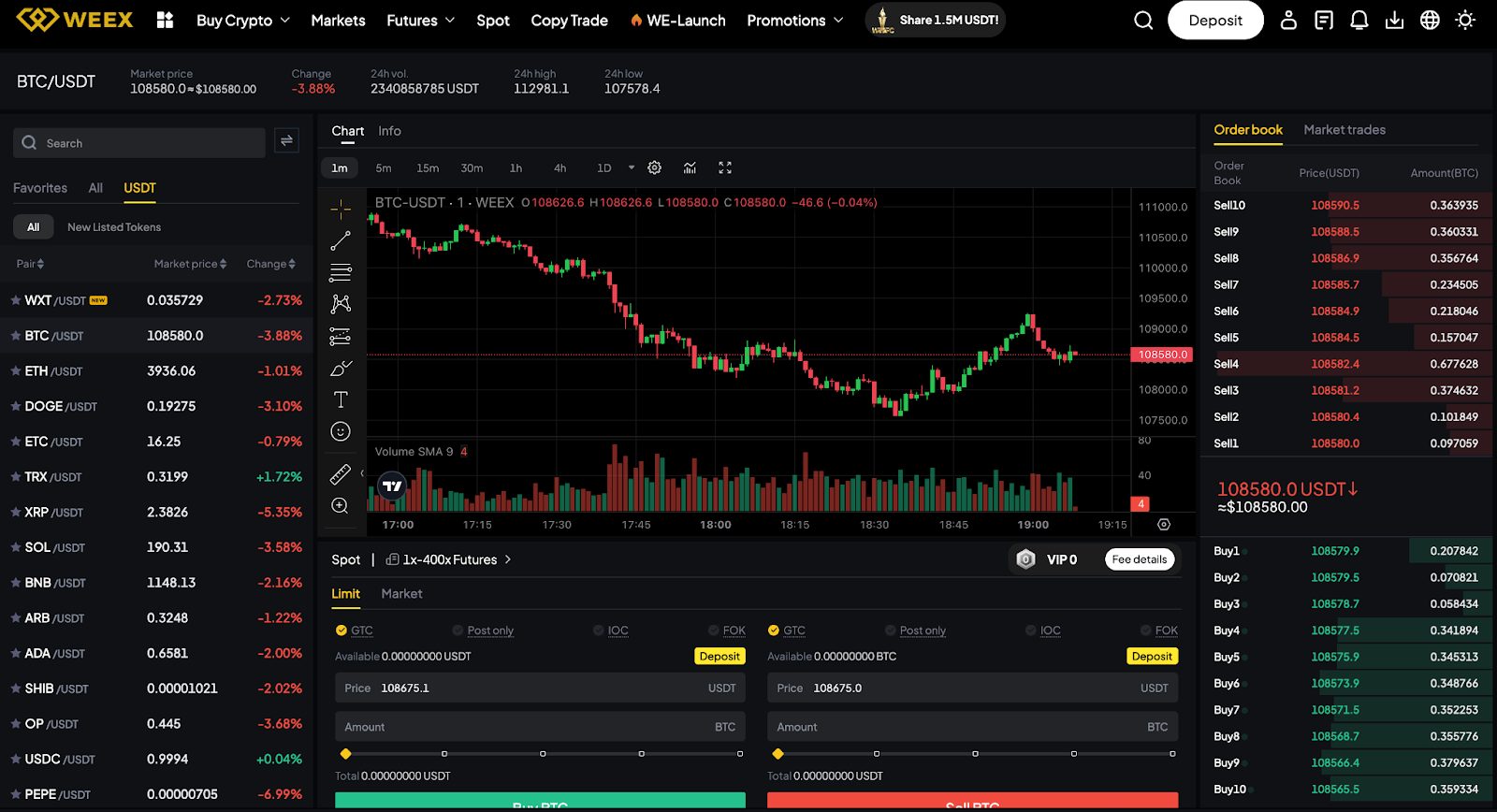 This places the Weex exchange among the most diverse crypto exchanges in terms of asset coverage, comparable with larger competitors like Binance or CoinEx. Most activity focuses on high-volume coins such as BTC, ETH, and USDT, where liquidity remains consistently strong.