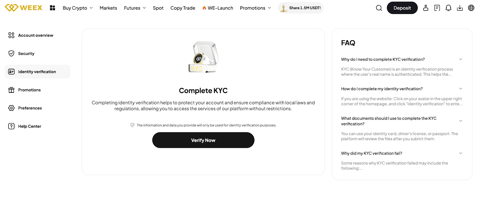 To unlock full access, including higher withdrawal limits and various services like fiat deposits, complete the KYC verification process.