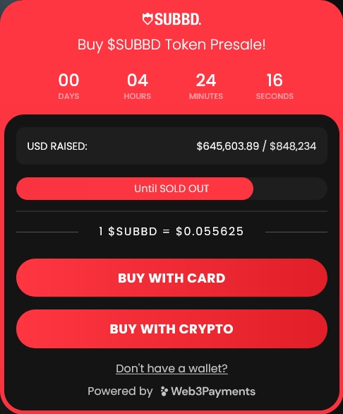 The native cryptocurrency, $SUBBD, can be staked during the presale for 20% fixed annual percentage yield (APY) rewards. So far, over 6.3 billion $SUBBD have been staked on the platform