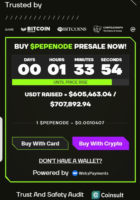 While the presale lasts, investors can buy $PEPENODE tokens at a discounted price. The token will be used in-game to build and upgrade the mining machines. To combat inflation, 70% of the tokens used for this purpose will be burned and removed from circulation.
