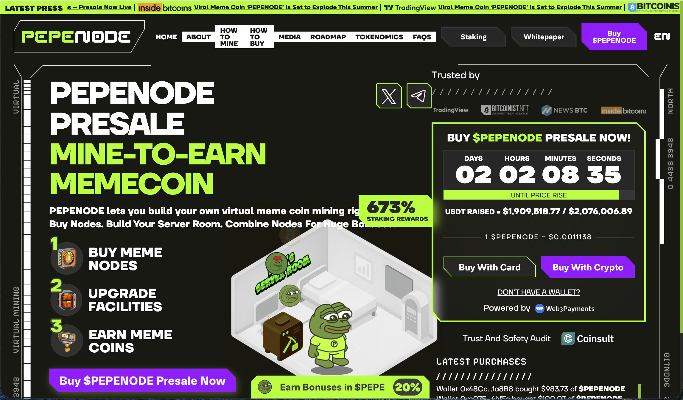 PEPENODE is an ERC-20 mine-to-earn token that lets you build virtual rigs, stake early, and earn through a browser dashboard. You assemble miner nodes and facilities that simulate hashrate and rewards with simple, on-screen controls. And after TGE, mining gameplay and accounting move on-chain for verifiable tracking. Staking is available during the presale and governed by smart contracts on Ethereum. And meme-coin bonuses like PEPE and FARTCOIN are slated within the reward mix.