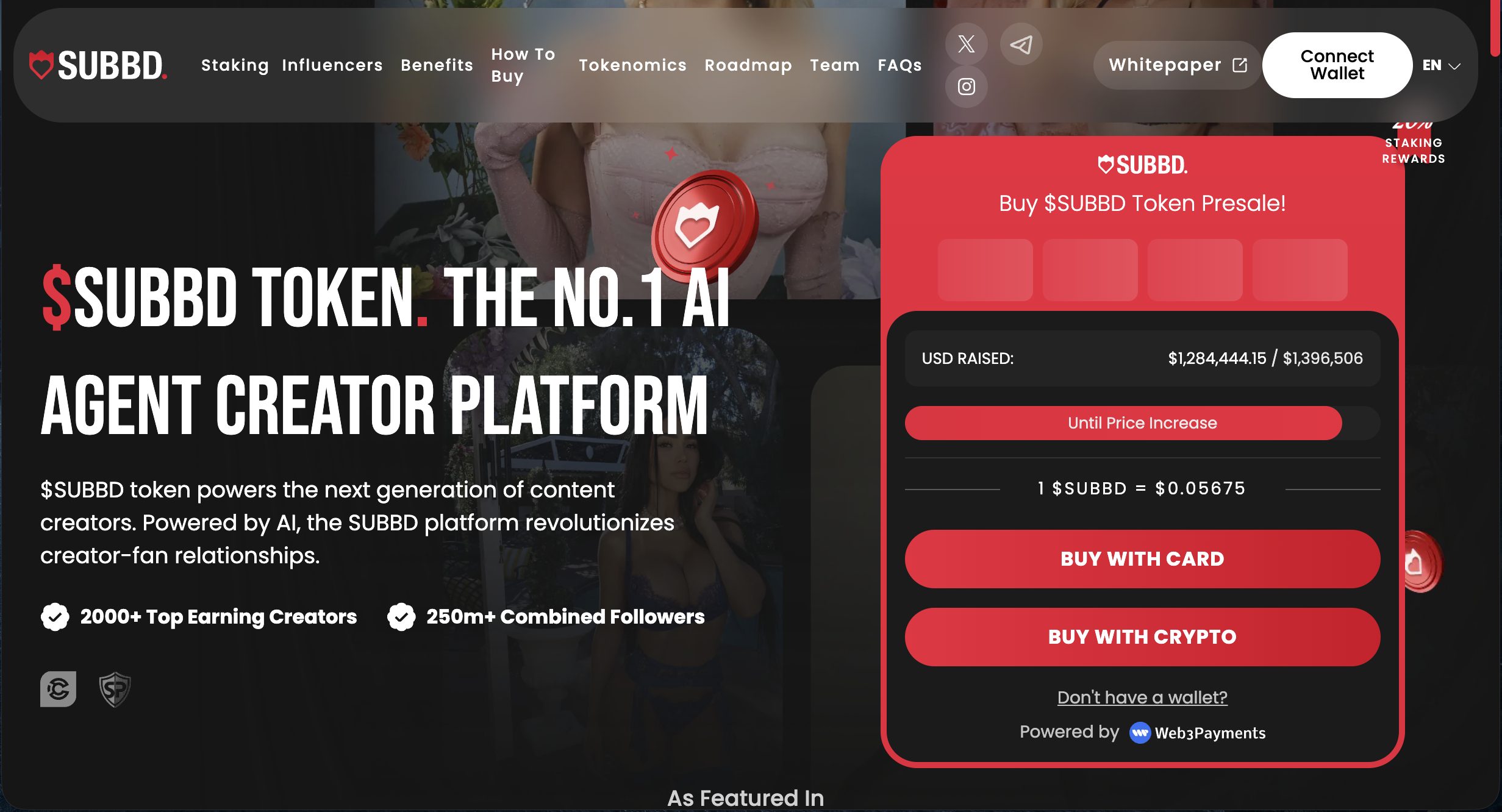 SUBBD ($SUBBD) is a newly launched ICO that aims to disrupt the $85 billion creator economy by merging AI, Web3 coins, and tokenized content monetization. Unlike traditional content platforms, SUBBD gives creators full control over their earnings while enabling fans to access premium content, stake tokens, and interact with AI-powered influencer personas.