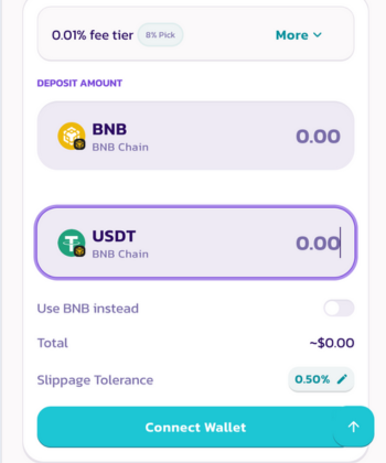 Pick your pair. For example, USDT/WBNB (or your preferred pair) and the fee tier shown for that market.