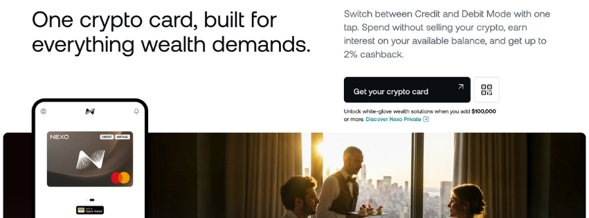 | Cashback | Rewards on eligible card spends | Up to 2% in NEXO or 0.5% in BTC at Platinum | $100 eligible purchase at 2% = $2 in NEXO |