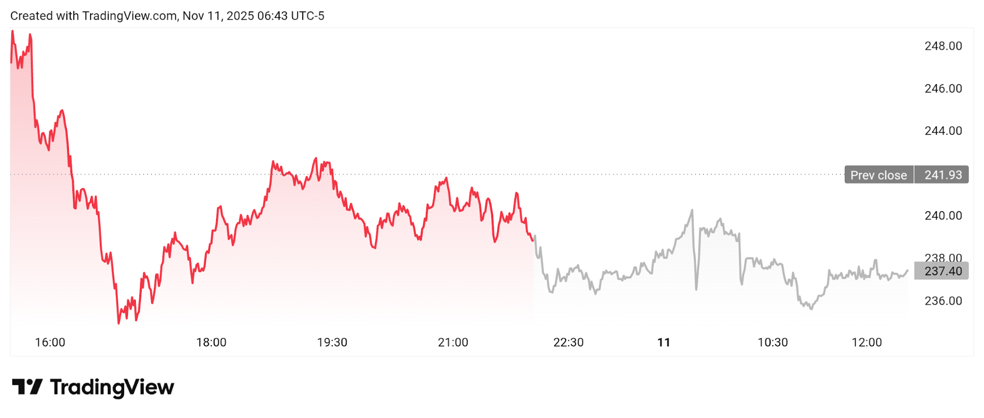 As of time of writing, Strategy’s stock is at $237.40, down 4.52% in 5 days and around 26% for the month as Bitcoin trades near $106,000.